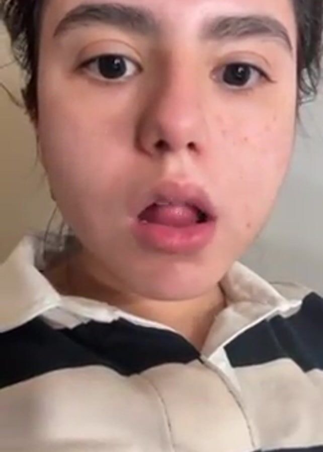 A young woman chews something in her mouth, presumably gum, as she looks directly at the camera