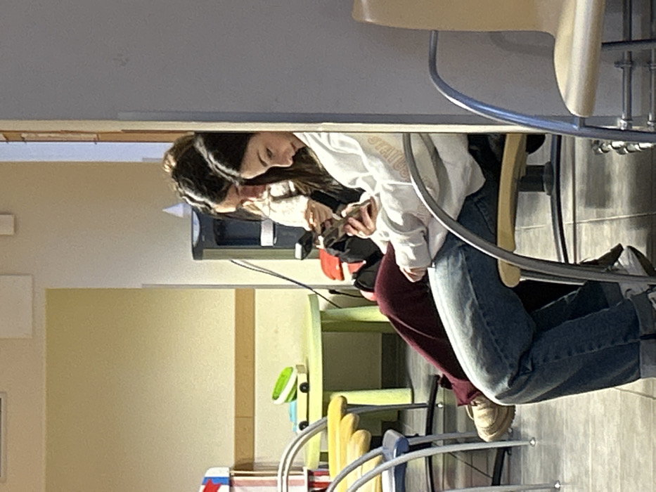 Two girls sit side by side at a table, their heads close together, looking at a phone. The girl in front wears a white sweatshirt and jeans. Her companion is partially obscured, but has dark hair. They are seated on metal chairs with light-colored seats. Behind them is a green table with colorful chair backs. A wall with neutral paint is visible in the background.