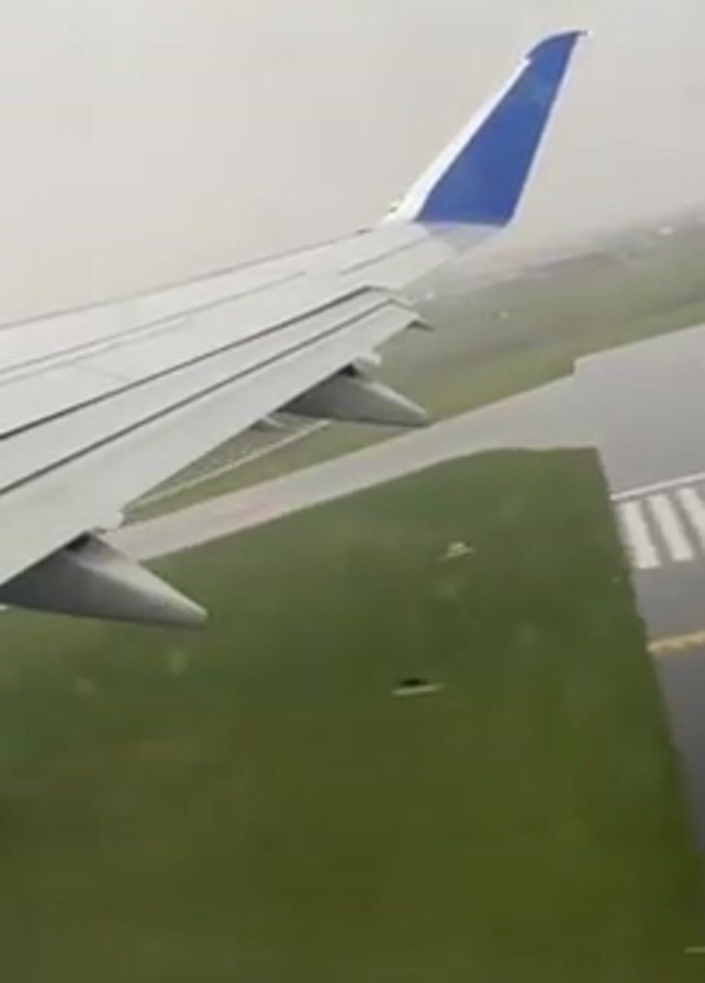 n airplane descending, with the runway visible from the window. The airplane wing is prominent in the foreground. As the plane descends, various airport features come into view, including taxiways, other airplanes, and ground infrastructure. The weather appears to be overcast.