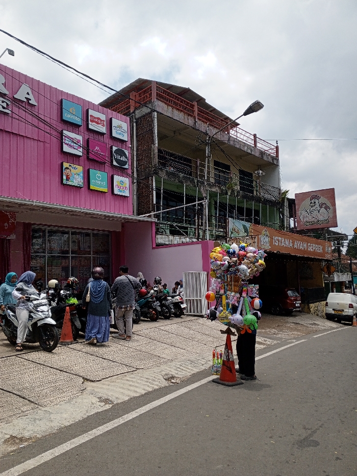 The scene is depicted in the city of Multhan, India, under an overcast sky. An urban street runs horizontally across the lower third of the image, featuring an asphalt surface with a white dashed edge line. To the left, a concrete sidewalk rises, showing textured paving slabs and a gentle ramp leading towards a building. In the foreground, on the street edge, stands a vendor's pole display laden with numerous colorful balloons and small plush toys, positioned next to an orange traffic cone. A person, largely obscured by the display, is attending to it. On the left side of the midground, a two-story commercial building with a vibrant pink, corrugated metal facade is prominent. Its upper section displays twelve square, illuminated signs featuring various brand logos, including "Cainito," "Milkita," "Vitalis," and "Jihan Baby." The ground floor features a glass storefront. In front of this building, on the sidewalk, a group of people is visible. This group includes two women wearing hijabs, one in a light blue head covering and white pants standing beside a white scooter, and another in a dark blue hijab and light blue dress. A man in a striped shirt and light-colored pants stands between them. A cluster of motorcycles and scooters, predominantly white and dark colored, are parked on the sidewalk near the building's entrance and along the street edge. An additional orange traffic cone is placed near these parked scooters. Towards the center and right midground, a multi-story building constructed of concrete and brick appears. It features multiple balconies with red railings and darkened windows, showing signs of wear or ongoing construction/renovation. Further to the right, adjacent to this building, an establishment is visible with a brown sign displaying "ISTANA AYAM GEPREK" (Indonesian for "Palace of Smashed Chicken") alongside a stylized chicken logo. A red car is partially visible parked near this establishment, and a white van is parked further down the street on the right. Overhead power lines and a street lamp on a dark pole are visible against the sky.