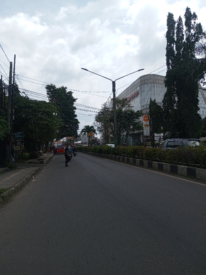 This image depicts a street scene in the city of Khajuripada, India, observed from a low vantage point on an overcast day. A two-lane asphalt road, lacking clear markings, extends from the foreground into the mid-distance, gently curving towards the right. On the left side of the road, a concrete sidewalk runs parallel, bordered by dense green trees and vegetation. Multiple dark utility poles with numerous intersecting overhead wires are visible among the trees. A dark rectangular sign with light text is partially visible on one pole. An individual clad in dark attire is walking directly on the asphalt road, approximately in the center of the left lane, facing away from the camera. Further down the left side, an orange-red car and several motorcycles are present near the curb. On the right side of the road, a concrete median topped with manicured green bushes separates the lanes from the adjacent area. Beyond this median, a large, multi-story commercial building with a light-colored, paneled or ribbed facade is prominent in the mid-ground. Red lettering is visible on its upper section. A very tall, slender tree with distinct upward-reaching branches stands prominently to the far right of this building. A tall black street light pole with a horizontal arm supporting two luminaires is positioned in the mid-ground on the right, extending over the road. A dark-colored SUV or similar vehicle is visible behind the median on the right side. The sky is predominantly covered with white and grey clouds, indicating cloudy conditions.
