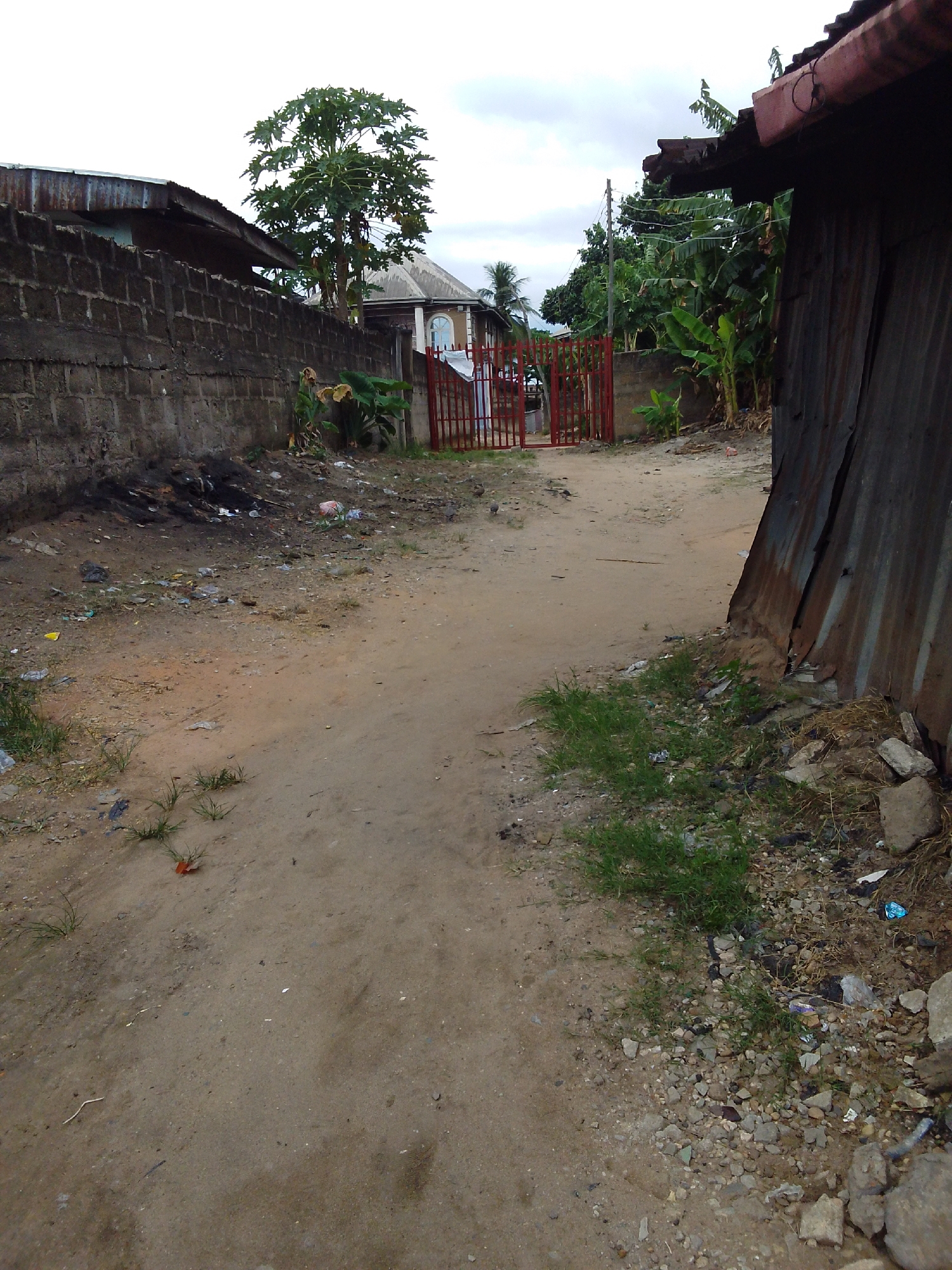 The image depicts a dirt road in what appears to be a residential area of Aba, Nigeria