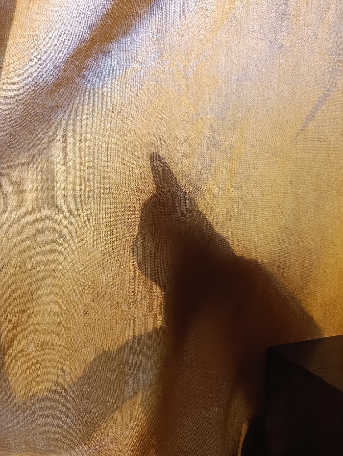 An amber curtain is partially illuminated. A dark shadow, resembling a cat with perked ears, is cast upon the fabric. A dark, geometric shape, possibly a furniture corner, is seen to the right of the shadow near the bottom of the frame. The curtain's texture is visible, adding depth to the overall scene. The lighting highlights the wrinkles and contours of the draped material.