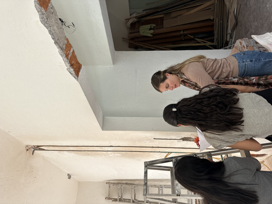 Three women are looking at an unfinished ceiling. The ceiling has exposed rebar and a section with missing plaster revealing the brick beneath. A stepladder and a metal frame are on the floor. The woman closest to the camera has long dark hair and wears a gray sweatshirt. The woman in the middle has long dark curly hair and wears a light gray t-shirt. The woman in the back has long blonde hair and wears a brown patterned sweater.