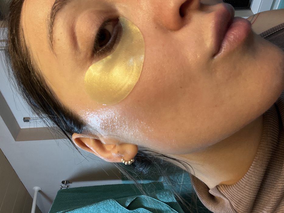 A close-up shot depicts a woman with a gold eye mask under her left eye. Her skin appears dewy and reflective. She has dark hair pulled back from her face, and she's wearing small, gold beaded earrings. The background shows a partial view of a bathroom with green towels and a white tiled wall. Her face is angled towards the camera, focusing on the eye and cheek area.