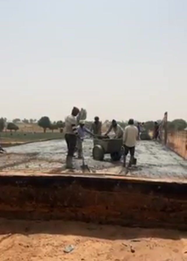 construction workers pouring concrete onto a large surface reinforced with rebar. The men, dressed in everyday clothes and some with head coverings, use wheelbarrows to transport the wet concrete and then spread it across the surface. The surrounding environment consists of a flat, sandy terrain with sparse vegetation. The sky is bright and clear, indicating a sunny day. The camera is positioned at a low angle, providing a view of the construction site from a slightly elevated position, and remains stationary throughout the video.