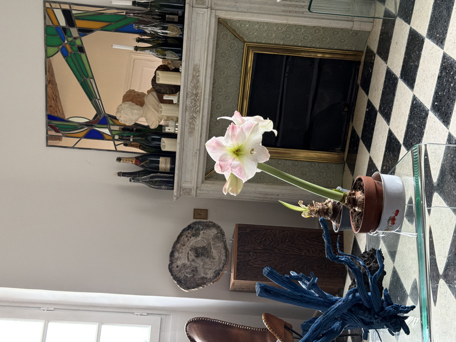 This image depicts an interior residential space, specifically a room located in Mauléon-d'Armagnac, France. The scene is brightly illuminated by natural light entering from a tall, white-framed window visible on the far left. In the foreground, a prominent potted Amaryllis flower with large, light pink and white petals and a green stem is centered. It rests in a brown terracotta pot, which is placed inside a white enamel bowl adorned with red cherry decals. This assembly sits on a clear glass coffee table. To the left of the Amaryllis, also on the glass table, is a vibrant blue, gnarled wooden decorative object, resembling a piece of driftwood. A second, smaller potted plant with a visible bulb is partially visible behind the Amaryllis. The middle ground is dominated by a classic white marble fireplace with ornate carved detailing on the mantelpiece. The fireplace opening is recessed, appearing black, and framed by a prominent gold border with an intricate patterned inlay. The floor features a black and white checkerboard pattern, suggesting terrazzo or large tiles. Above the fireplace, a rectangular mirror is mounted, featuring an abstract, geometric border in stained-glass style, incorporating green, blue, orange, and gold segments. The mirror reflects an unseen door and a light-colored ceiling. The mantelpiece itself is adorned with multiple objects: a collection of approximately ten empty champagne bottles, including visible Moët & Chandon and Dom Pérignon brands, arranged on both sides; several cream-colored pillar candles; and a white classical bust sculpture of a person, centrally positioned. To the left of the fireplace, a dark wooden pedestal supports a large, oval slab of petrified wood, displayed vertically on a clear stand. A portion of a brown leather armchair with visible stitching is seen in the lower left quadrant. The walls are uniformly white. No individuals are present in the scene.