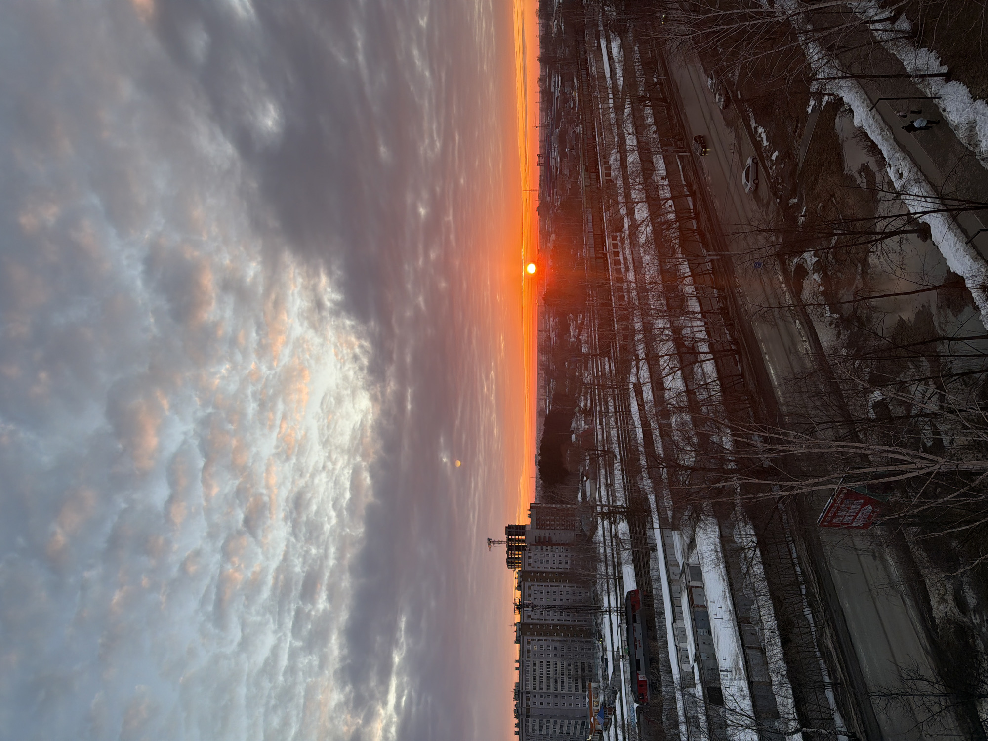 The image depicts an elevated view of an urban landscape in Chaikovsky, Russia, at sunrise or sunset. The sky is dominated by a vibrant orange sun positioned on the horizon, with the lower atmosphere displaying intense orange and red hues. Above, a dense layer of altocumulus clouds is visible, ranging from dark gray near the horizon to lighter gray with faint pink and orange tints higher up. In the mid-ground, a series of multi-story residential buildings, primarily light-colored, are visible to the left. One taller building among them features a visible tower crane on its roof, indicating ongoing construction. To the right of these buildings, further industrial or commercial structures are silhouetted against the bright horizon. A network of multiple parallel railway tracks extends horizontally across the scene, partially covered by snow. A red and gray locomotive is discernible on one of the tracks to the left. Below the railway lines, a long row of low-rise, utilitarian structures, possibly garages, is visible, interspersed with patches of snow and bare ground. In the foreground and lower mid-ground, two main asphalt roads run horizontally. The road closer to the viewer shows several parked cars and one silver sedan in motion, while a black SUV with illuminated headlights is visible on the upper road, moving away from the perspective. Bare deciduous trees line the roads, their branches devoid of leaves, indicating late winter or early spring conditions. Melting snow, ice patches, and significant puddles are present along the roadsides and sidewalks. On the sidewalk of the lower road, two individuals, dressed in dark winter clothing, are walking away from the viewer. A large, vertical red banner with Cyrillic text is partially visible on the right side of the lower road, obscured by trees. The overall environment is characterized by an urban setting with a mix of residential, industrial, and transportation infrastructure, under a dramatic, low-angle solar illumination.