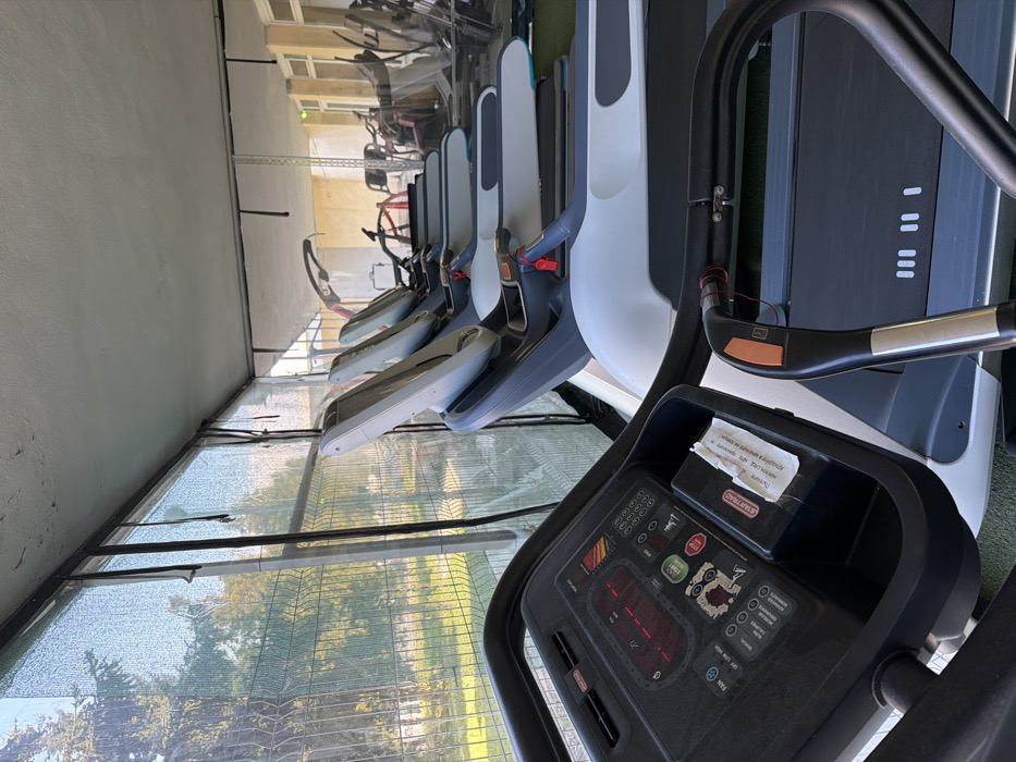 The image displays a fitness facility, identified as being in Vratsa, Bulgaria. The scene shows a section of the gym dominated by a row of at least five unoccupied treadmills. In the immediate foreground, the control panel of a black and grey 'Startrac' treadmill is visible, featuring red digital displays, an array of control buttons (including 'Start' and 'Stop'), and a compartment containing a white note with Cyrillic text. The treadmills, primarily white, grey, and black, are arranged linearly with their consoles facing towards the viewer's right. Each machine is currently idle; no individuals are present or interacting with the equipment. A small red safety clip is attached to the console area of several treadmills in the row. To the left, the facility features a large opening covered by a translucent mesh screen, providing a view of the outdoors. This exterior scene includes mature green trees, a grey metal fence (possibly chain-link), and a patch of grass illuminated by natural daylight. The interior floor beneath the treadmills is covered with a green mat. In the background, further gym apparatus, consistent with cardio equipment, is discernible.