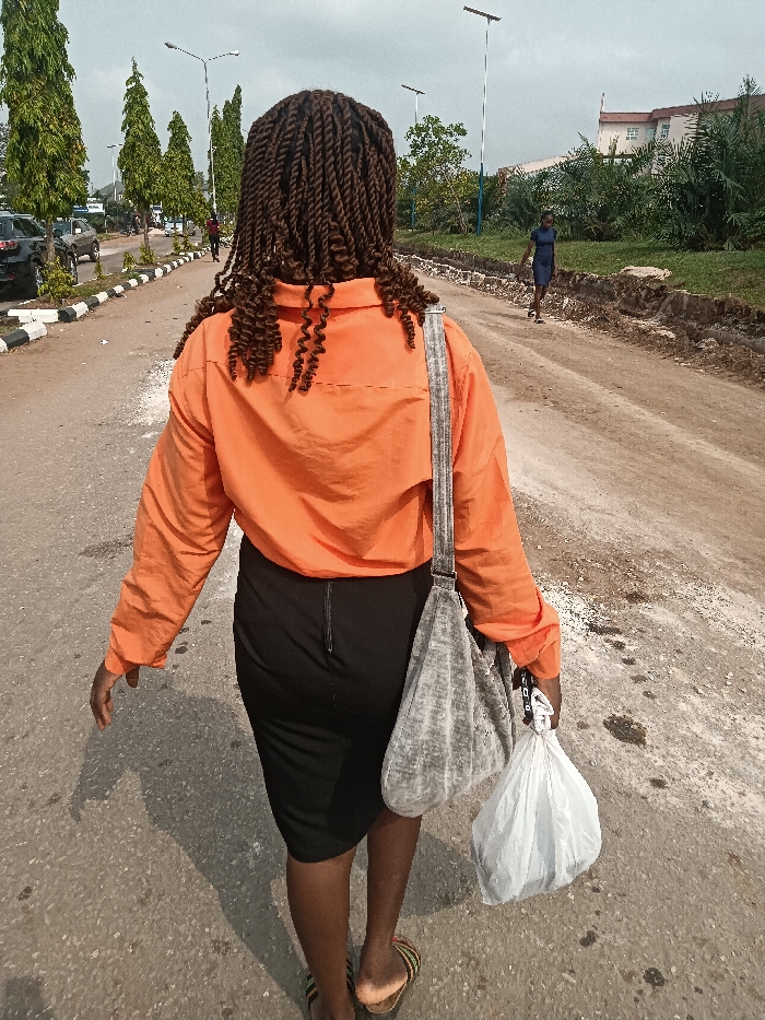 This image captures a street scene in Owerri, Nigeria, under an overcast sky. The primary subject, viewed from behind, is a person with dark skin and braided brown hair, wearing an orange long-sleeved collared shirt, a black knee-length skirt with a visible rear zipper, and striped flat sandals. This individual walks on a paved asphalt road, carrying a grey textured shoulder bag over their left shoulder and a white plastic bag in their right hand. To the immediate left of the paved road, a black and white striped curb separates the roadway from a paved shoulder where several dark-colored vehicles are partially visible, followed by a line of tall, slender evergreen trees. Multiple modern streetlights with flat, rectangular fixtures are spaced along this side of the road. To the right of the primary subject, an unpaved, uneven dirt path runs parallel to the paved road, showing exposed soil and rough terrain. Further right, beyond this path, is a strip of green vegetation, including bushes and smaller trees. In the distant right background, a large building with a red roof and light-colored walls is partially visible amidst the foliage. A second individual, dressed in a dark blue garment, is seen walking further down the unpaved path on the right side of the frame, also moving away from the camera. A long shadow of the primary subject is cast onto the paved road to their left.