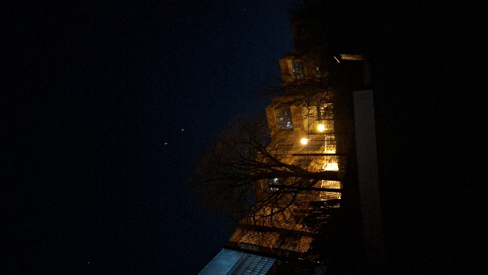 A nighttime shot features a building illuminated by warm, yellow streetlights