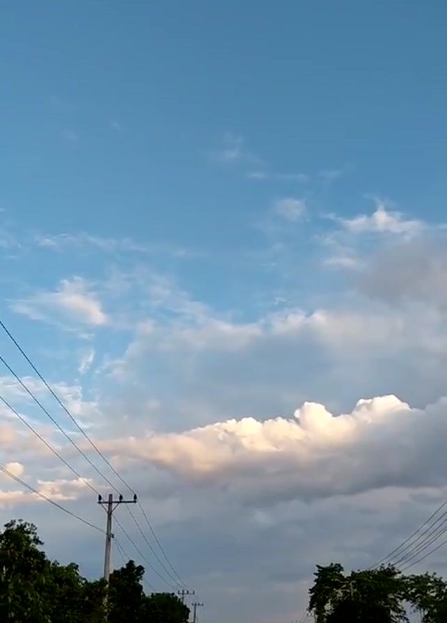 view from a vehicle driving down a road. The road is asphalt and has a white line dividing it. On either side of the road is green foliage, including trees and bushes. Power lines run along the sides of the road, supported by wooden poles. The sky is mostly blue with some white and grey clouds. A bird flies across the sky. Two motorcycles can be seen ahead on the road. The overall impression is a journey through a rural area on a partly cloudy day.