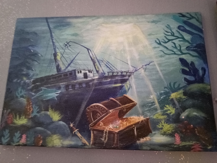 The image displays a horizontally oriented painting, likely on canvas, situated in Tumfure, Nigeria. The painting depicts an underwater scene featuring a large, dark-hulled shipwreck resting on the seabed, its mast and rigging extending towards the surface. A grey shark is observed swimming to the left of the shipwreck. In the foreground, slightly right of center, an open wooden treasure chest is present, overflowing with gold coins, pearls, and other jewels. A dagger with a decorative hilt is positioned upright in the seabed next to the chest. The underwater environment incorporates various marine flora, including corals and seaweed, in shades of red, green, and blue, covering the seabed and surrounding the shipwreck. Multiple shafts of light penetrate the water from above, illuminating the scene. The water exhibits a blue-green color gradient, consistent with depth.