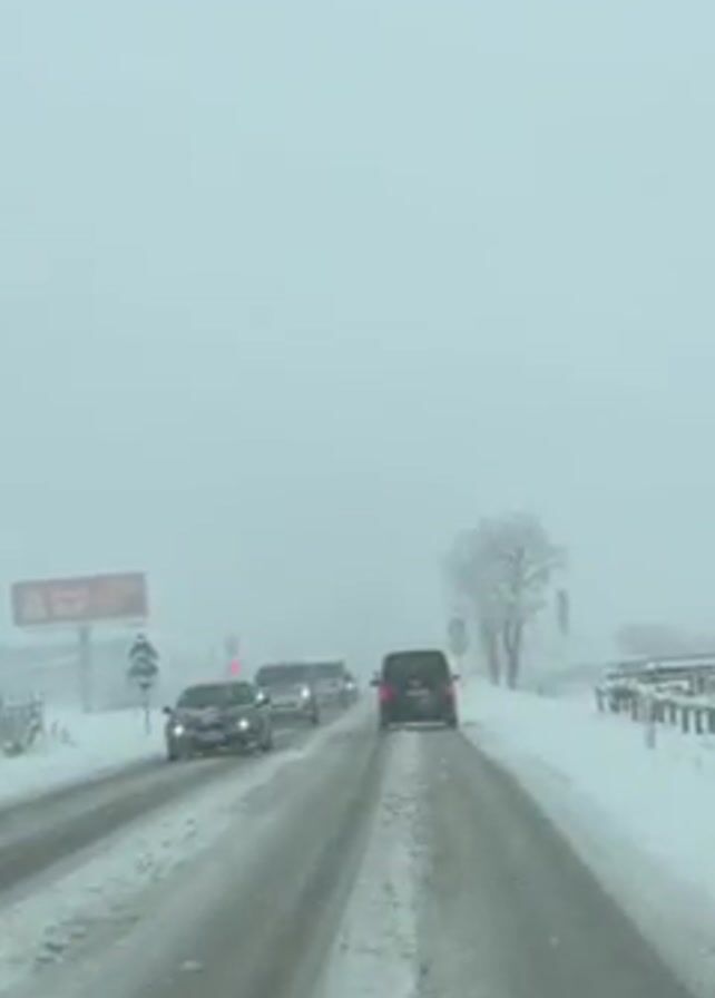 The view from inside a vehicle driving on a snow-covered road shows several cars driving ahead in the same direction. Snow is actively falling and visibility is poor. The road is mostly clear but has snow on the edges and packed snow in the tire tracks. There is a billboard on the left side of the road and a tree on the right side. The overall atmosphere suggests difficult driving conditions due to the winter weather.