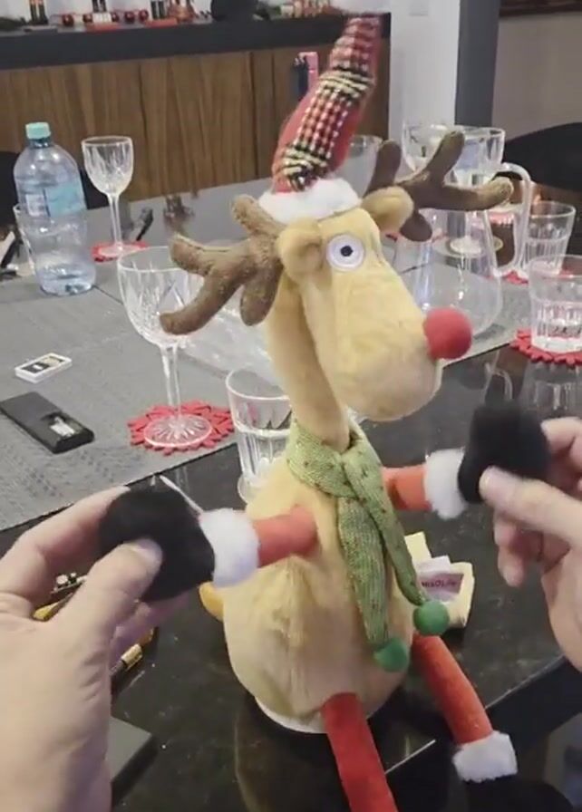 person holding a toy reindeer in their hands. The reindeer is wearing a red and green plaid hat, a green scarf, and red and white gloves. It has a red nose and googly eyes. The person is manipulating the toy, causing it to wobble and make noises. The video is shot indoors, on a glass table with various items on it, including glasses, a water bottle, coasters, and tools. In the background, there is a buffet filled with Christmas decorations and other items.