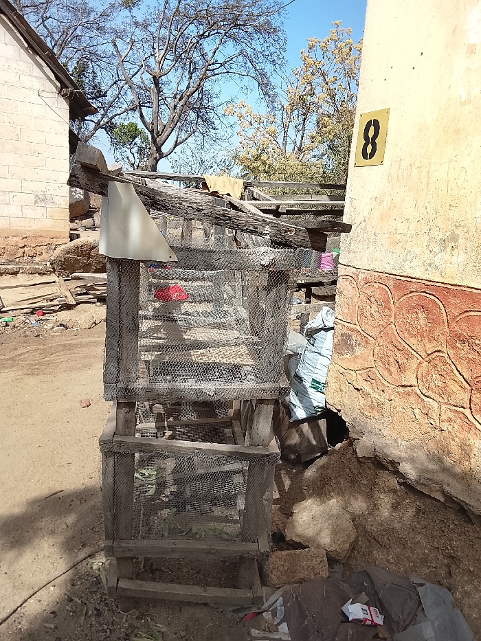 This image depicts an outdoor scene in Jos, Nigeria, under bright sunlight. The foreground is dominated by a two-tiered wooden structure, approximately 1.5 meters tall, constructed from raw lumber and wire mesh, likely an animal cage. The upper tier contains green leafy material and a red plastic bowl. A white, triangular piece of corrugated plastic acts as a partial roof. To the immediate right, a light-colored building wall with a decorative reddish-brown base featuring a curvilinear pattern is visible. A yellow square plaque with the black number "8" is affixed to this wall. Beneath the wall, exposed soil, rocks, and various debris, including a large white sack with green text, are present. To the left, a portion of a concrete block building with a dark, gabled roof edge is partially visible. The ground in the mid-left appears to be dry earth, scattered with wooden planks and assorted refuse. The background features several deciduous trees with bare branches against a clear blue sky, with some trees showing sparse, light-colored foliage. No individuals are visible in the scene.