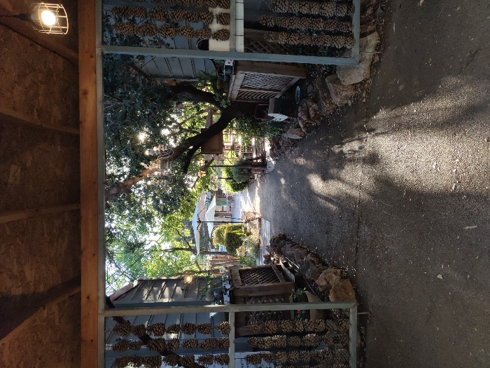 The image displays an outdoor pathway entrance located within the Mate Asher Regional Council, Israel, illuminated by natural light. The foreground features a dark, coarse paved path with long shadows extending from left to right. Overhead, a wooden beam structure, consistent with a pergola or covered entryway, is visible, with a caged light fixture attached to its underside on the right. Vertically arranged strands of pine cones are affixed to metal frame structures on both the left and right sides of the pathway. Large, irregular rocks delineate the path's edges. The pathway extends into the midground, bordered by green foliage, including shrubs and a large tree on the right. A multi-armed, white chandelier-style light fixture is suspended from a branch of this tree. Sunlight filters through the tree's leaves, creating bright highlights and lens flare effects. On the left, a light-colored, wood-paneled building is partially visible. On the right, a structure with a lattice-style paneling is present. The background reveals an open outdoor area equipped with white market umbrellas and seating, suggesting a commercial or communal space. No individuals are present in the scene.