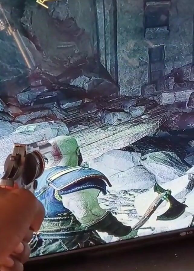 A hand holding a revolver points towards a flat screen television that is displaying a video game scene. The game is God of War, and the character, Kratos, is standing in a rocky area, his back to the viewer. A yellow arrow is displayed in the upper left corner of the screen. The person holding the gun fires a shot, and the screen shakes.