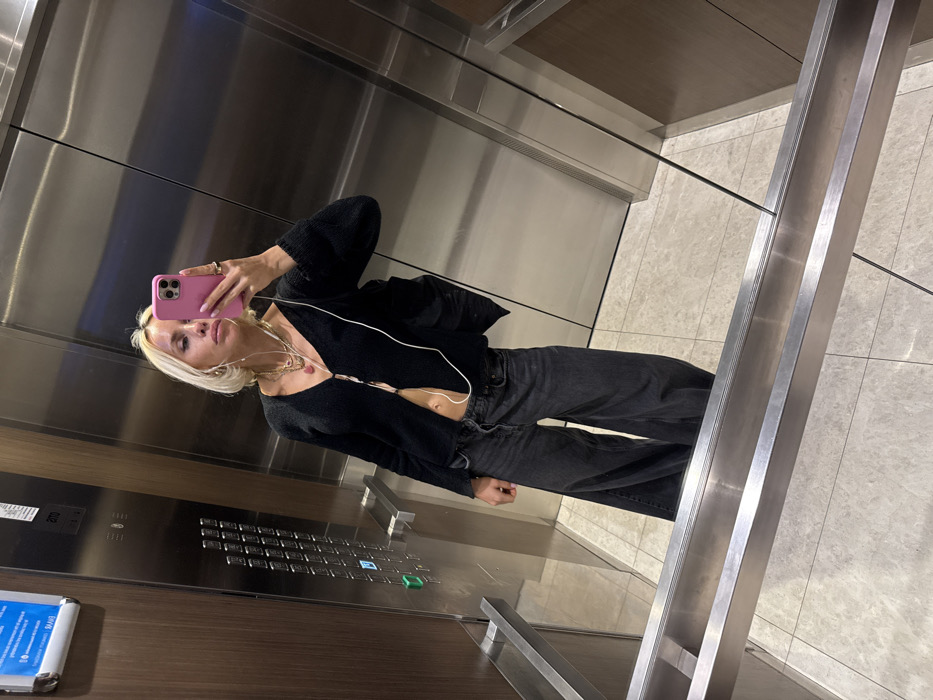 A woman with blonde hair takes a mirror selfie in an elevator. She wears a black cardigan, slightly unbuttoned, dark jeans, and multiple necklaces. She holds a pink smartphone in her right hand. The elevator interior is modern with stainless steel walls and a control panel visible on the left. A metal railing is in the right foreground. The floor is light-colored tile.