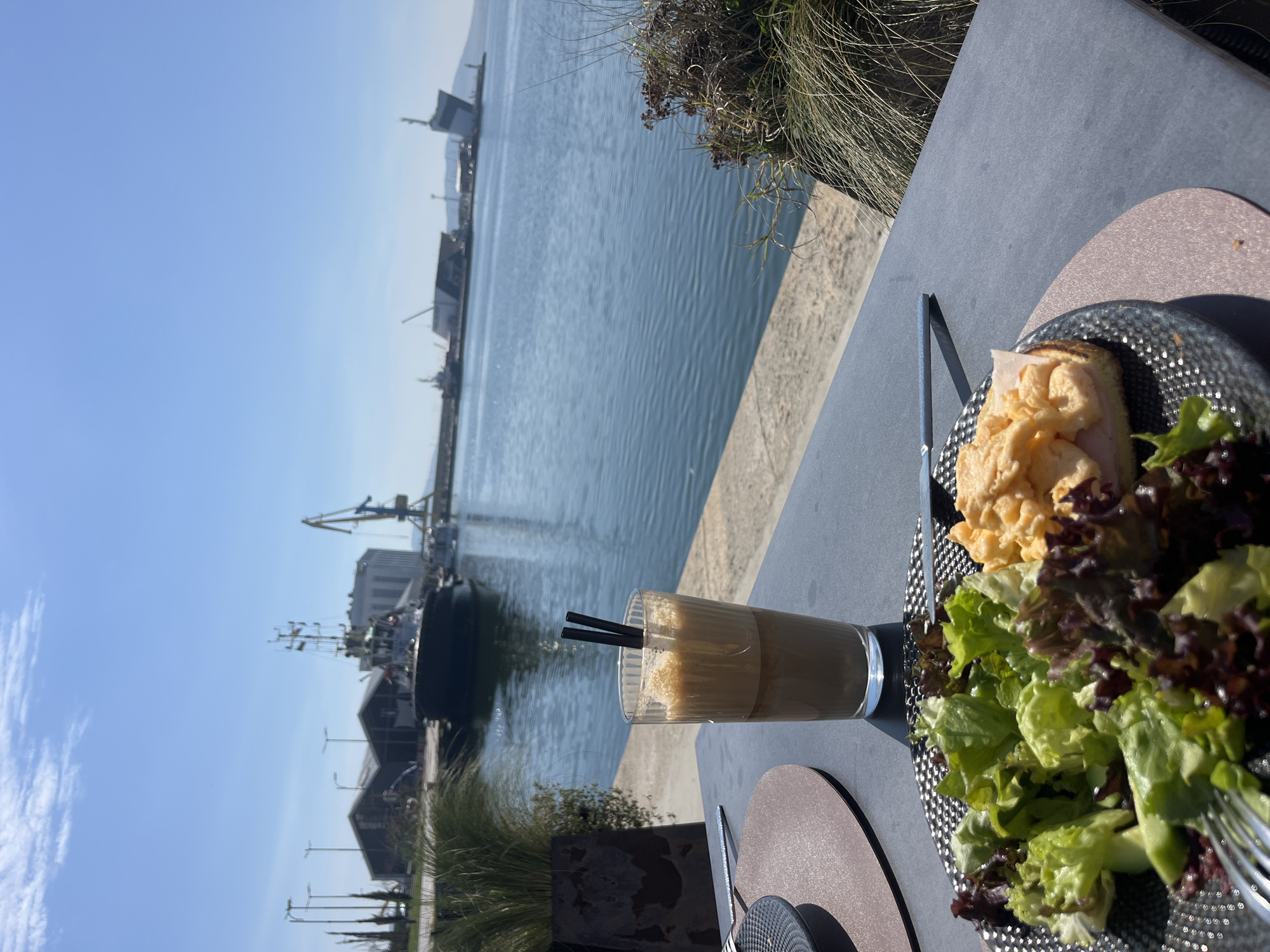The image depicts a table setting with a glass of iced coffee and a plate of food consisting of a sandwich with scrambled eggs and a side salad. The table is situated outdoors, likely at a restaurant or cafe, with a view of the harbor in Burgas, Bulgaria. Cranes, buildings, and ships are visible in the background across the water, suggesting an active port area. The sky is clear and blue, indicating a sunny day.