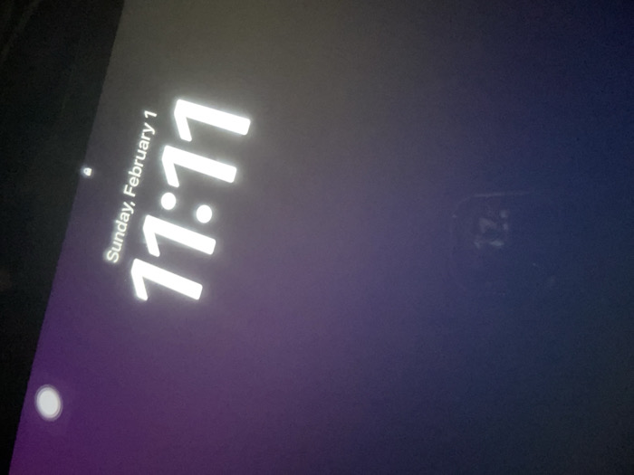 The image displays a digital screen, tilted, showing a lock screen interface. The screen exhibits a gradient background, transitioning from dark purple on the left to dark blue on the right. Prominently displayed in large white characters is the time "11:17". Above and to the left of the time, the date "Sunday, February 1" is shown in smaller white text. A small, white circular icon is present in the lower-left portion of the screen, with another similar, smaller indicator near the top-left. A faint, blurred, numerical artifact, possibly a reflection or ghosting resembling "12", is discernible in the upper-right quadrant. No visual elements within the image provide information regarding its specific location in Fegersheim, France.