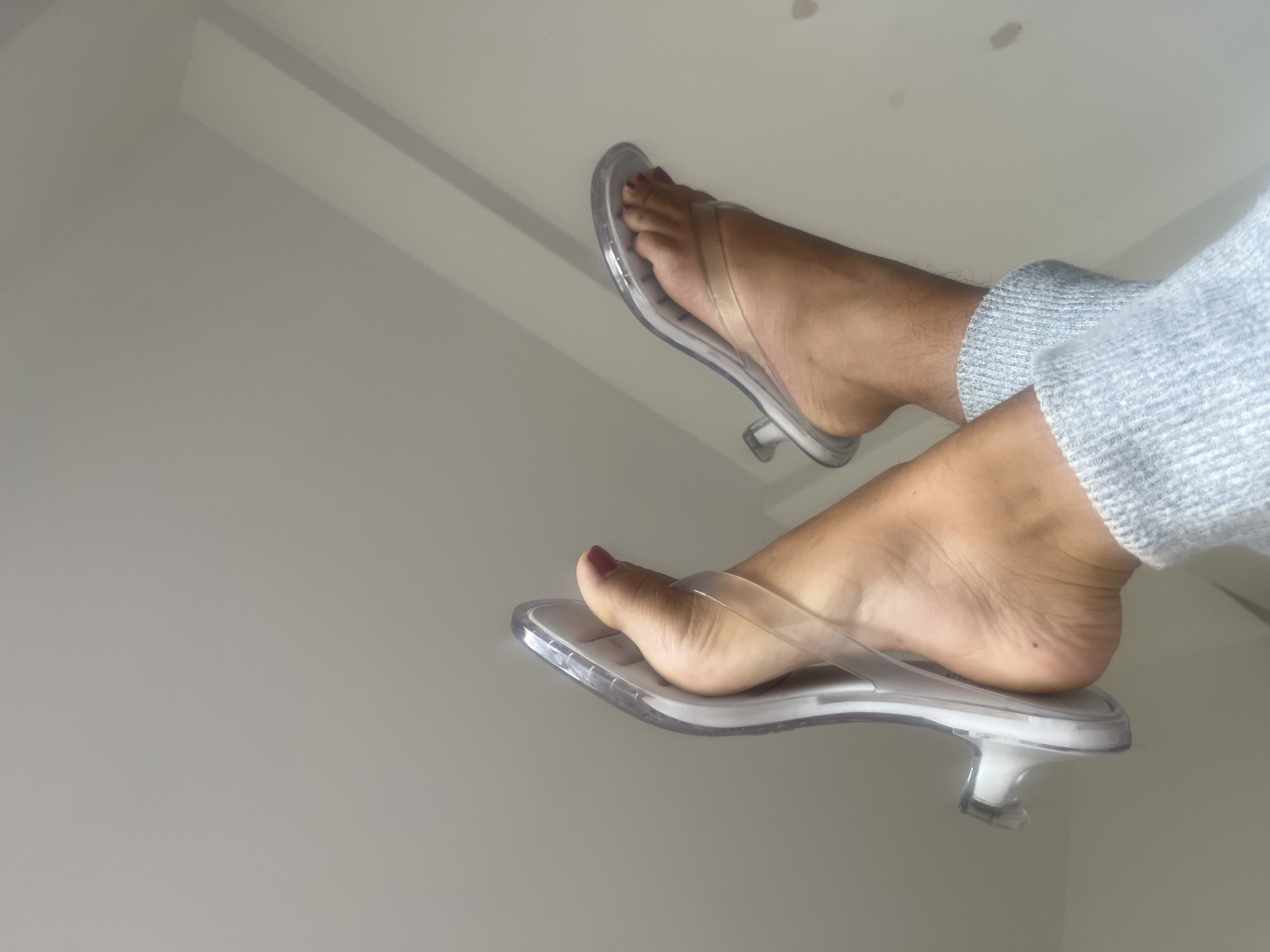 A low-angle, upward-facing image depicts two human feet adorned with clear plastic high-heeled thong sandals. The feet exhibit a medium-brown skin tone; the big toenail on the right foot is painted with red polish. A light gray, textured fabric, consistent with loungewear, covers the lower part of the left leg, near the ankle. The background is a plain, light-toned interior wall or ceiling, displaying several faint, irregular dark smudges on the right side. The lighting is diffused. No discernible features within the image allow for the determination of a precise location in the city of Buenos Aires, Argentina.