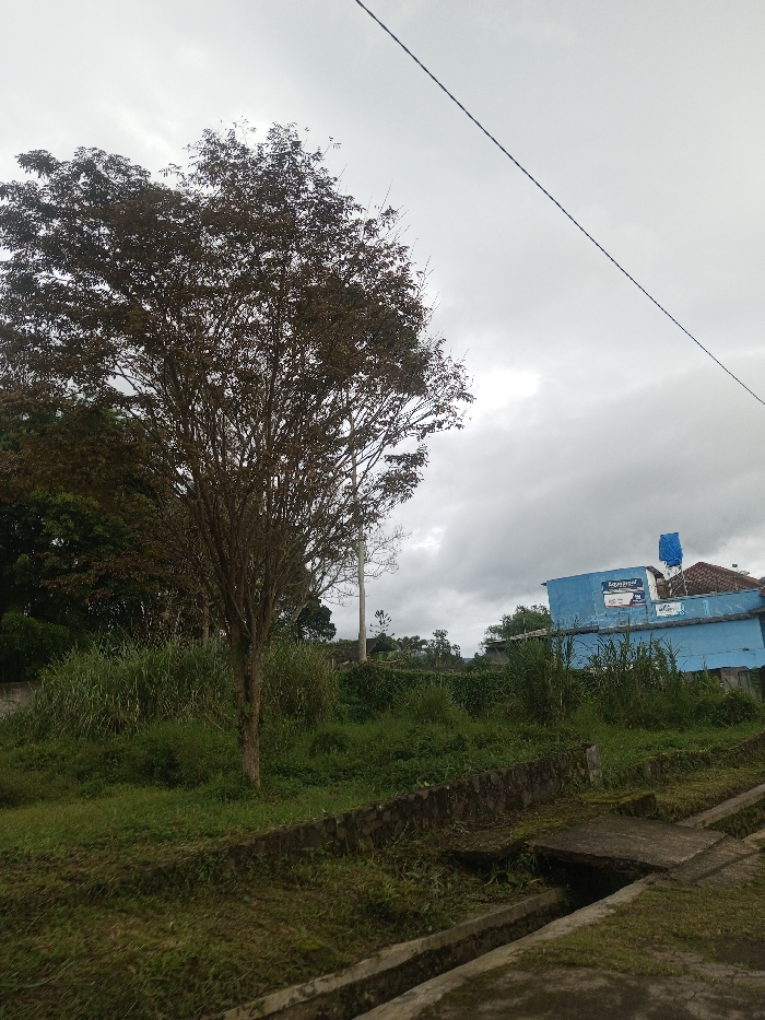 The scene, located in Sandamal Eliya, Sri Lanka, depicts an outdoor environment under an overcast sky. The sky is largely covered by light grey clouds, with a single dark wire or cable stretching diagonally from the upper-left corner to the mid-right. In the mid-left of the frame, a prominent tree with a relatively slender trunk and a dense canopy of dark green and brown foliage stands. Behind this tree and extending towards the center, a dense area of tall, green, unmanaged vegetation or grasses is present. Further to the left, more dense trees form a darker green backdrop. In the mid-right background, a single-story building with light blue painted walls and a reddish-brown tiled roof is visible. A blue cylindrical water tank is situated on the roof. A white rectangular sign with dark text and a logo is affixed to the front wall of the building. The foreground features a strip of mown green grass leading to a low retaining wall constructed of irregular dark grey and brown stones. Parallel to this wall, a concrete drainage ditch with an open channel runs from the lower-right towards the center-left. A concrete slab covers a section of this ditch, forming a small culvert or crossing point. No people or animals are visible in the scene.
