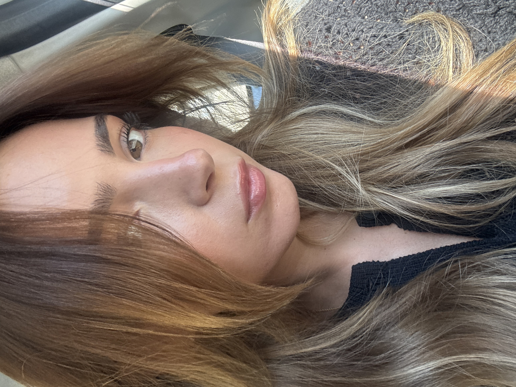 A close-up portrait of a young adult female, approximately 20-30 years of age, is captured inside a vehicle