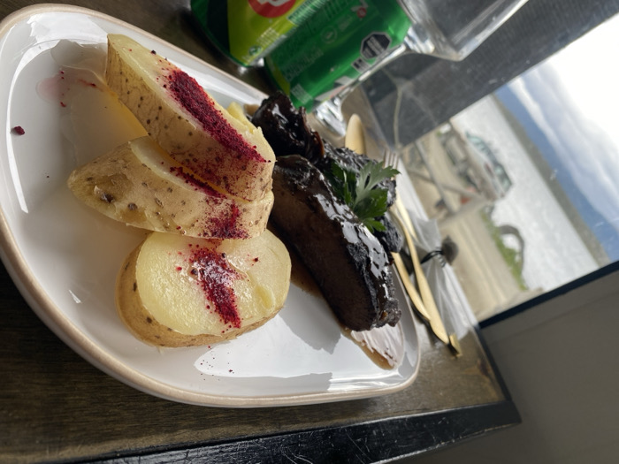 A plate of food features sliced potatoes topped with a vibrant red powder, and a portion of dark, glazed meat garnished with a sprig of parsley. A gold-colored fork and knife rest on a napkin to the side. In the background, a green can and a glass can be seen, suggesting a drink accompaniment. The scene is set near a window, with a glimpse of the outside visible.