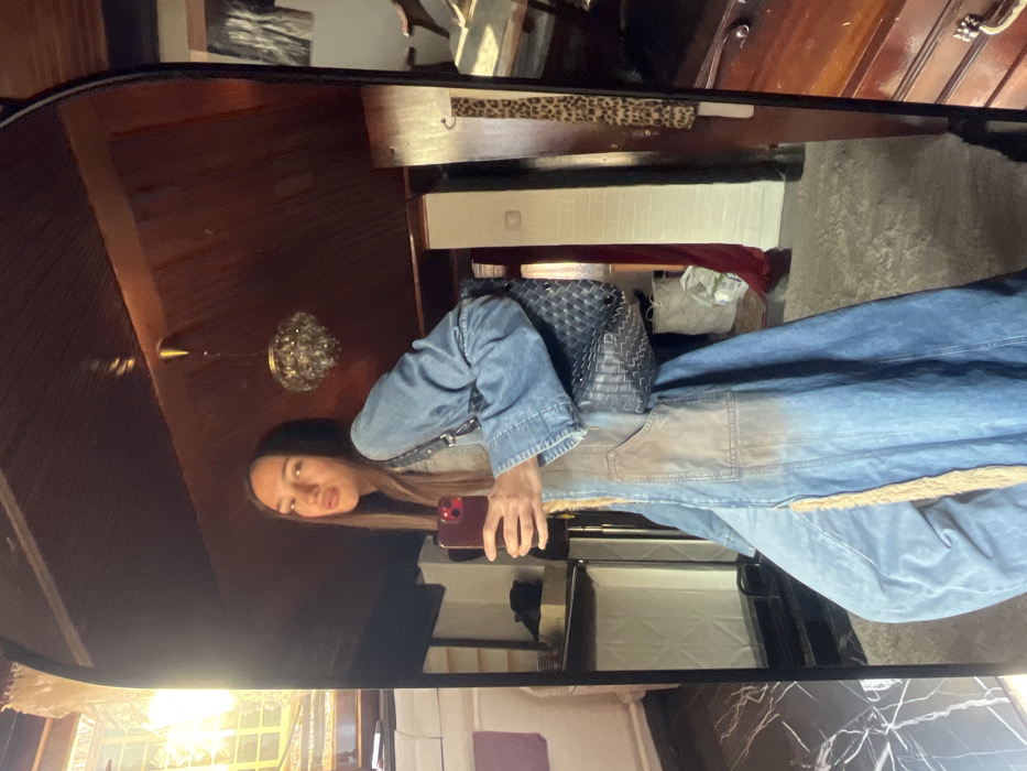 The image depicts a young adult female, reflected from the waist up in an arched, rectangular mirror. She is holding a red smartphone with her right hand, angled as if taking a selfie, and is looking directly into the reflection. Her long, dark hair with lighter strands frames her face. She wears a long-sleeved, full-length garment made of light and medium-toned denim, featuring a washed or distressed appearance and a lighter, possibly fluffy, beige trim along its opening and around prominent pockets. A dark, quilted handbag or backpack with a woven pattern is slung over her left shoulder. The reflected indoor environment, likely a private residence or boutique, showcases an eclectic style. The ceiling and upper walls are covered in dark, possibly wooden, paneling with a reflective surface. A glass or crystal chandelier hangs centrally from the ceiling. To the left, a bright light source, possibly a window, illuminates the scene. Reflected objects include a dark, multi-tiered shelving unit to the left, and a dark wooden dresser or cabinet with a light-colored handle to the right. A leopard-print fabric strip hangs vertically on the wall to the right. Higher up, an abstract, monochrome piece of framed artwork is visible. A dark, vintage-style wooden chair is partially visible on the far right. The floor appears to be covered by a light-colored carpet or rug. No specific landmarks or unique architectural features are visible to determine the precise location within Sofia, Bulgaria. The setting is definitively indoors.