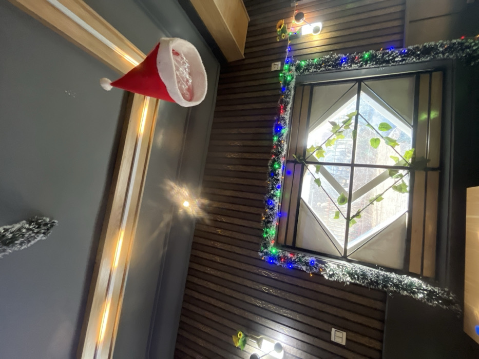The image depicts an indoor commercial space, possibly in Sabon Gari East, Nigeria, characterized by festive decorations. The scene is observed from a low-angle perspective, looking upwards towards a window and ceiling. The walls are covered with vertical dark wood paneling. The ceiling is gray, featuring light-colored wooden beams with integrated warm yellow strip lighting. A red and white Santa hat is suspended from the ceiling in the upper right quadrant of the image. Further left, a segment of silver tinsel is also suspended from the ceiling. A central window is framed with dark trim and adorned with a silver tinsel garland intertwined with multi-colored string lights (red, green, blue). The window itself has multiple panes, including a prominent diamond-shaped central section. Artificial green leafy vines are draped across the interior of the window, obscuring part of the exterior view. Sunlight or a strong external light source creates a starburst reflection on the wooden wall paneling to the left of the window. Two wall-mounted sconces are visible; one on the left wall with two light sources, and another on the right wall with a single light source, topped by a yellow floral or sunflower-like embellishment. A portion of a light-colored wooden table is visible at the bottom of the frame. No individuals are present.