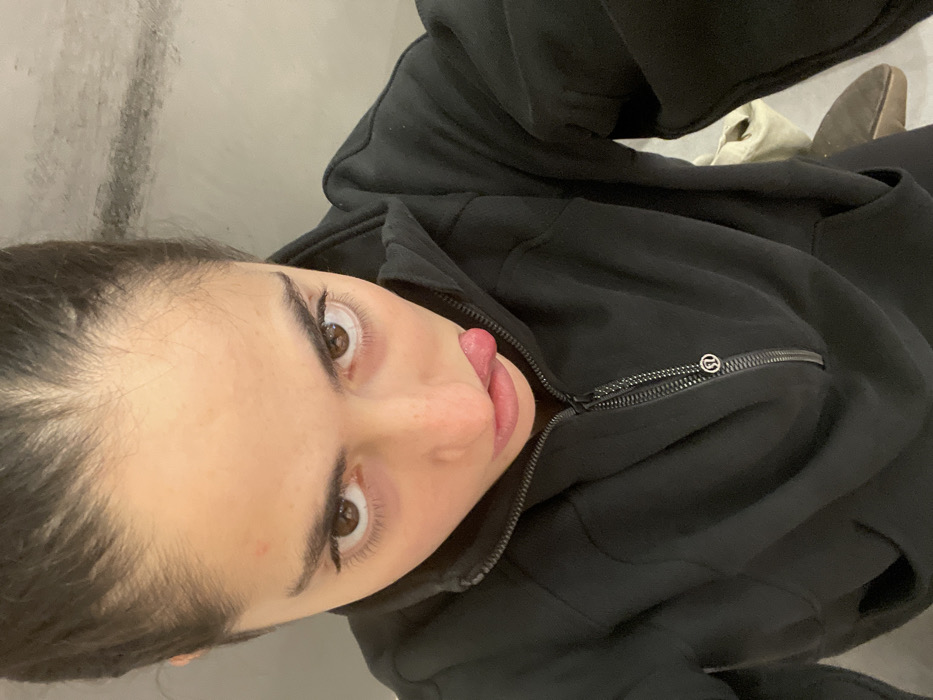 This high-angle portrait features a young adult female positioned in an unspecified indoor environment within Madrid, Spain. Her dark hair is pulled back from her face, revealing her forehead, and she has dark eyebrows and brown eyes that gaze directly upwards into the camera lens. Her mouth is slightly open, with her tongue extended horizontally from the left side. She is wearing a black long-sleeved quarter-zip pullover, secured with a silver zipper that includes a small circular Lululemon logo on its pull tab. The garment exhibits front pockets. The background consists of plain, light grey walls or surfaces, possibly concrete, with subtle darker horizontal striations on the upper right. On the lower right, a light-colored tote bag and a dark brown shoe are partially visible on a light-toned floor surface.