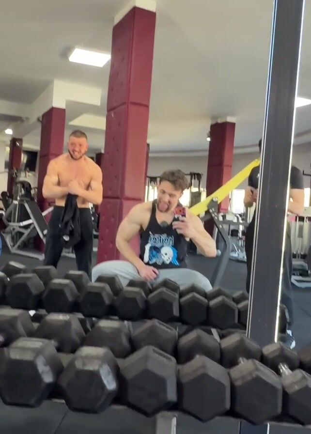 In a gym, three men are visible in a mirror's reflection. The man in the foreground is sitting cross-legged on a rack of black dumbbells, holding his phone up and sticking his tongue out. He is wearing a tank top with a graphic print and grey sweatpants. In the background to the left, a shirtless man is holding his black shirt. He is smiling and has a muscular build. To the right, a man wearing a black t-shirt and black pants is standing and looking towards the left. Gym equipment can be seen in the background. The mirror is framed by a grey metal pole. The gym's interior includes red pillars, a suspended yellow rope, and bright overhead lighting.