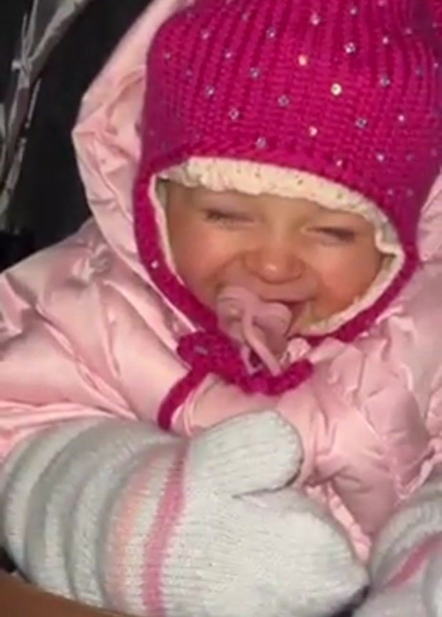A baby sits in a stroller or carrier, wearing a pink puffer jacket with a hood, a bright pink knit hat adorned with shiny decorative stones and a pompom, and white knitted mittens with pink stripes