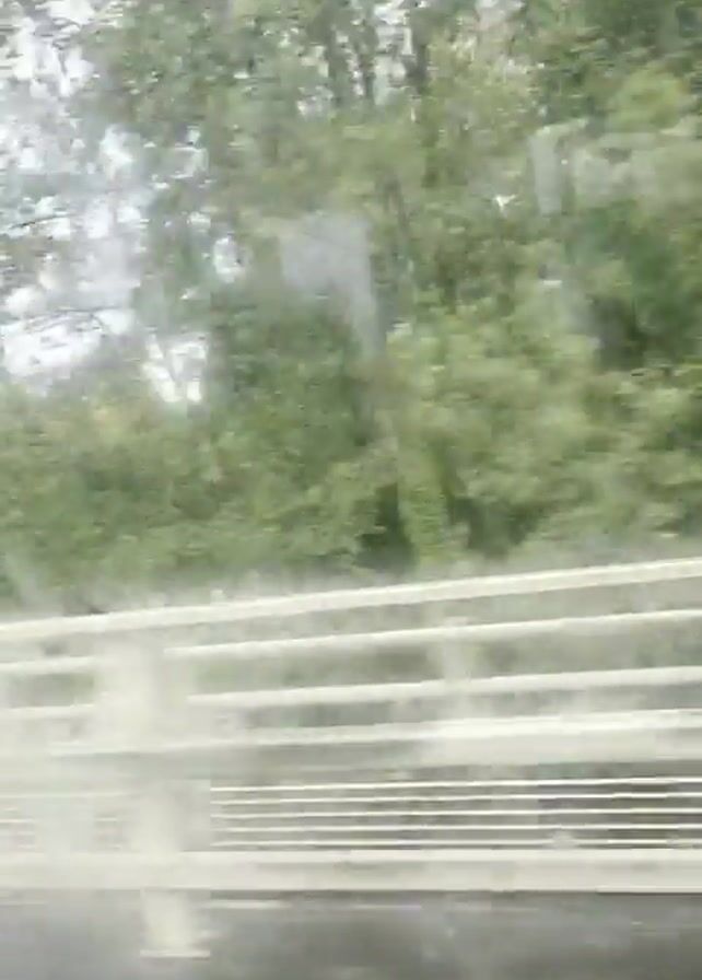 The video, shot from within a vehicle, shows a view over a bridge railing onto a multi-lane highway in overcast, rainy weather