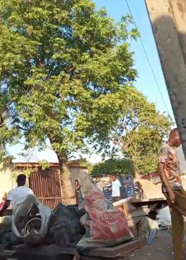 n outdoor scene in a village-like setting. In the foreground is a metal table laden with various bags and debris. A large tree provides shade over the area. Several people are present, some standing around the table and others in the background. The sky is blue with clear weather. There's a building with a corrugated iron roof on the left and a fenced yard in the background. A truck is partially visible behind the table. The focus is on the items on the table and the individuals near it, suggesting a possible transaction or sorting of goods.