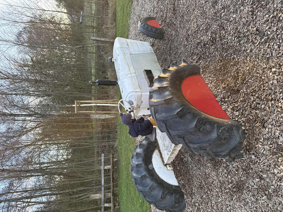 In Olingen, Luxembourg, an outdoor scene depicts a young child interacting with a static tractor playground structure. The child, dressed in a dark blue puffer jacket, yellow pants, and a grey knitted beanie, sits on a grey seat positioned on the tractor's frame. The child's hands are near a white steering wheel and a black lever. The tractor structure is an older model, painted light grey, with a black exhaust pipe visible on the right side of its engine cowling. It features oversized, real tractor tires embedded in the ground; the visible rear left tire has a white rim, the visible rear right tire has a red rim, and a smaller front tire also shows a red rim. The ground immediately surrounding the tractor is covered in dark brown wood chips. Beyond this area, green grass is visible, followed by a rustic wooden bench made of logs. A wire fence runs horizontally across the mid-ground, separating the immediate play area from a dense background of numerous bare deciduous trees under a bright, possibly overcast, sky. A young, staked sapling stands near the tractor, and faint sunlight penetrates the trees in the distance.