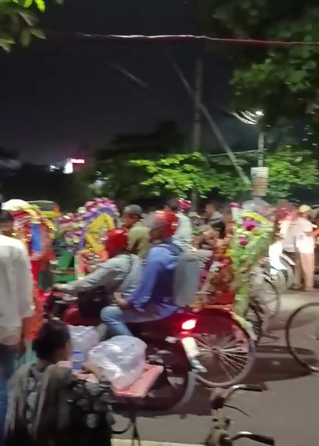 n evening scene in what appears to be a busy street in an urban area, possibly Bangladesh, as hinted by the presence of cycle rickshaws