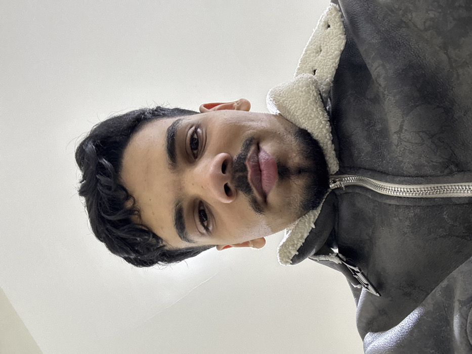 A male individual is depicted in a close-up, low-angle portrait. He possesses dark, curly hair, dark eyes, and a light-to-medium brown complexion, with a mustache connecting to a chin-strip beard. He wears a dark grey or black jacket featuring a cream-colored fleece collar and lapels, and a visible silver zipper. A silver buckle is present on the left collar. The subject gazes directly into the camera. The background is a plain, light-colored surface, offering no identifiable features or landmarks to determine a specific location within Fez, Morocco, or any other geographic region. No other individuals or objects providing context are visible.