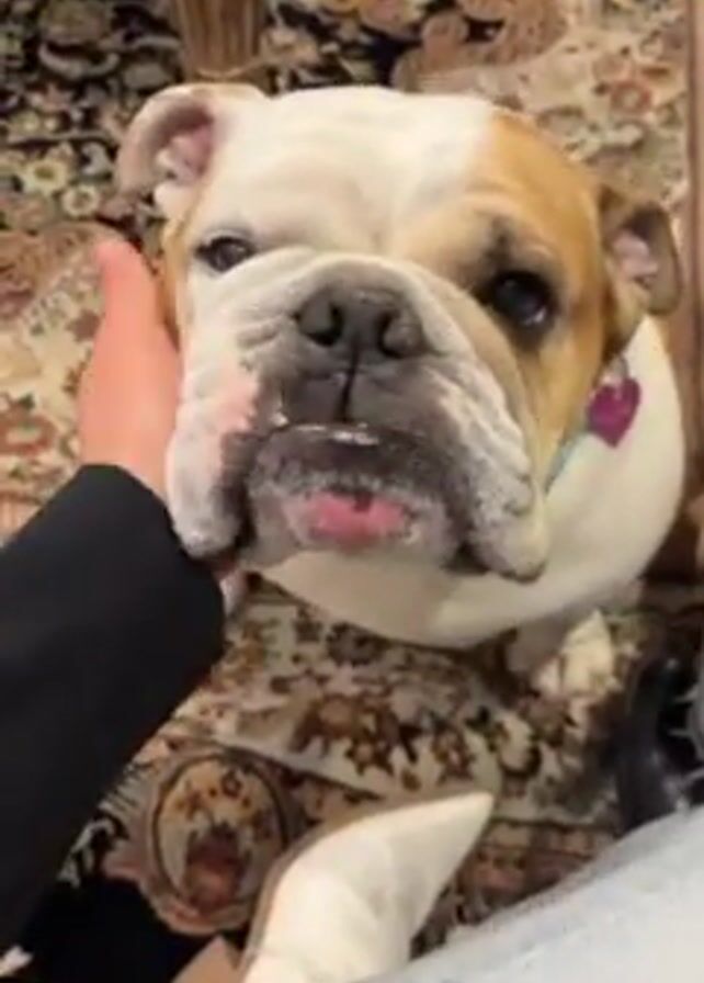 person petting an English bulldog. The dog is mostly white, with some brown markings on its head and ears. It is sitting on a patterned rug and wearing a light blue collar with a purple heart-shaped tag. The person is wearing a black long-sleeved shirt and white heels. The person pets the dog on the head and face. The background includes a decorative table leg and a patterned rug.