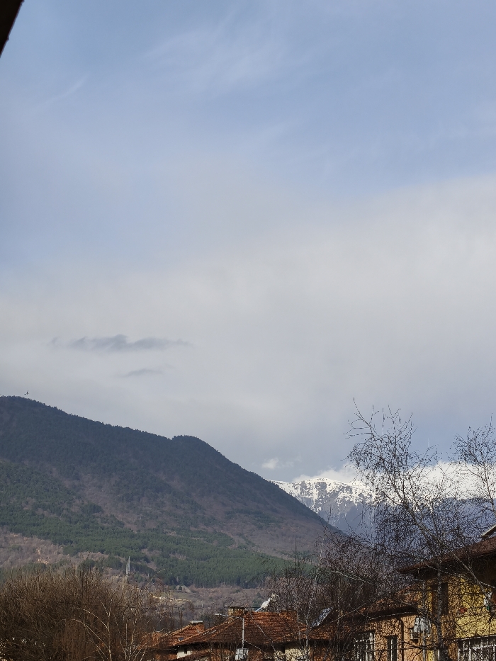 This image presents a view of Goce Delcev, Bulgaria, with a prominent mountainous landscape and residential structures in the foreground. The upper portion of the frame features a light blue sky with scattered white and grey clouds. A large mountain range dominates the mid-ground. The mountain on the left is densely forested with dark green coniferous trees, exhibiting areas of bare brown trees on its lower slopes. A slender, vertical grey structure is visible on the lower section of this mountain. To the right, a higher mountain peak is visible, characterized by bright white snow cover. The foreground contains the upper sections of residential buildings with reddish-brown tiled roofs. Building facades appear in shades of yellow and cream. Multiple leafless deciduous trees with intricate branch patterns are positioned in the foreground, partially obscuring the structures and lower mountain slopes. Two small, dark aerial objects are discernible in the upper left, near the apex of the forested mountain.