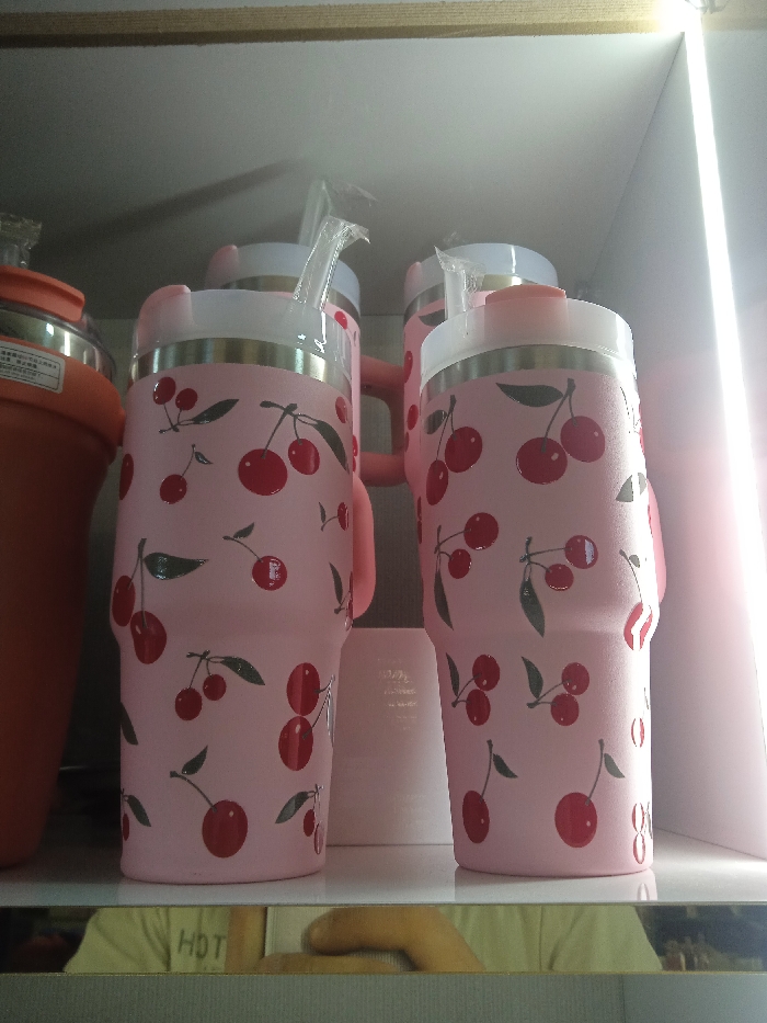 The image displays a retail or display setting in Barza Municipality, Syria. The foreground is dominated by two large, identical, light-pink tumblers, each approximately 25-30 cm tall. Both tumblers feature a repeating pattern of red cherries with green stems and leaves. They are equipped with white plastic lids and clear drinking straws, each straw individually wrapped in clear plastic film. Each tumbler has a matching pink handle on its side. To the immediate left, a portion of a larger, orange or terracotta-colored container with a metallic top rim and undecipherable script is visible. Centered between the two main pink tumblers in the background is a smaller, light-pink cup or container. The objects rest on a highly reflective surface, possibly a polished shelf or countertop, which shows a partial reflection of a person's upper torso, wearing a light-colored t-shirt with reversed text "HOT" and a visible arm. Above the items, a light-colored wooden beam or shelf edge spans the top of the frame. The scene is illuminated by overhead lighting, with an additional bright vertical light source, possibly an LED strip, visible along the right edge of the frame, indicating an indoor display or cabinet environment. No direct human interaction or explicit actions are depicted.