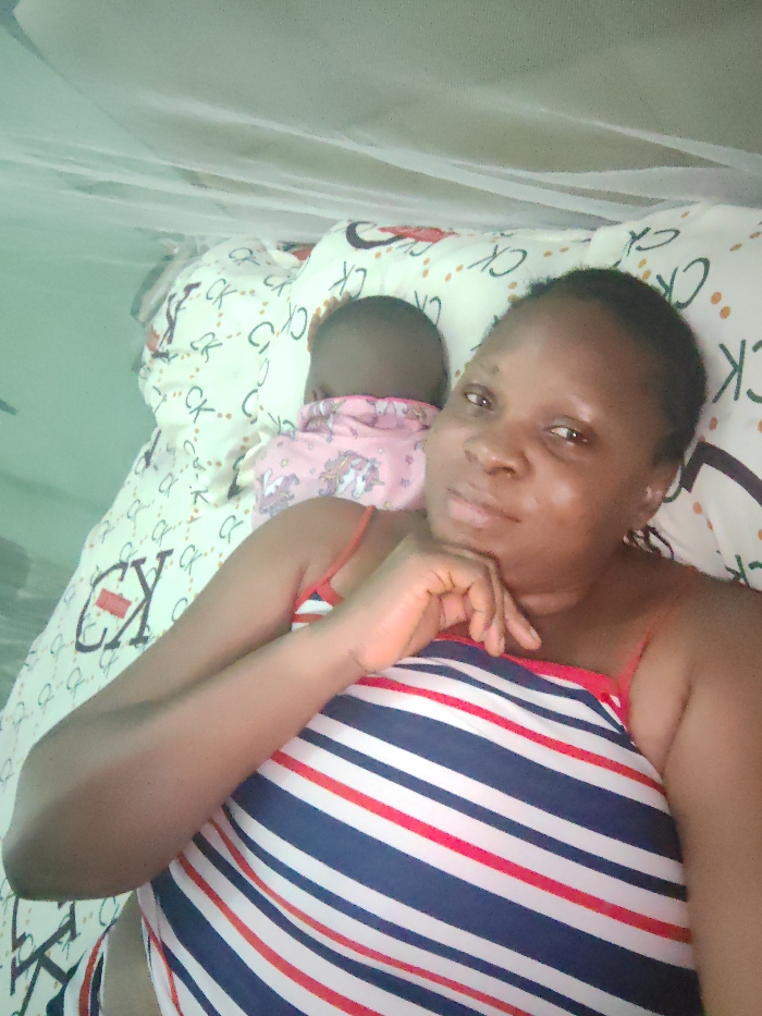 An adult female and an infant are depicted indoors, lying on a bed covered with white bedding featuring a repeating pattern of black and red "CK" logos and small orange dots. The adult female, positioned in the foreground, has dark skin and short dark hair, and is looking directly into the camera. She is wearing a horizontally striped top with red, white, and blue bands and thin red spaghetti straps. Her right hand rests beneath her chin. Behind her head, an infant, dressed in a pink patterned garment, is visible from the back of its head and upper torso, appearing to be lying on its stomach or side. A white, translucent mosquito net is draped above and partially around the subjects. The presence of the mosquito net is consistent with common household environments in Lagos, Nigeria, but no specific location within the city is identifiable from the visible details.