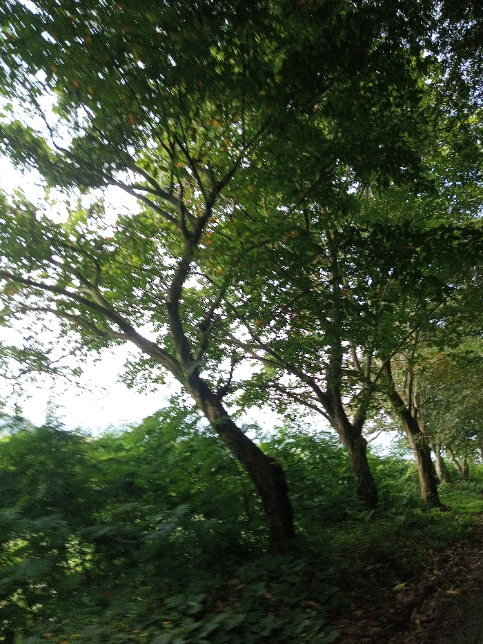 This image depicts a natural environment in Ariyalai, Sri Lanka. The scene is dominated by a dense arrangement of trees and undergrowth, viewed from a low perspective looking upwards into the canopy. Multiple tree trunks, dark and uneven, rise from the lower right and center of the frame, supporting extensive canopies of lush green foliage. Scattered within the upper tree canopy are small, lighter-colored spherical objects, possibly fruit. Below the tree canopy, a thick layer of green shrubs and smaller plants forms dense undergrowth. The ground on the right side appears to be an unpaved, dark earth path or natural terrain. A bright, overcast sky is visible through gaps in the foliage, particularly towards the upper left. The image exhibits motion blur, suggesting it was captured while in motion. No individuals, animals, or man-made structures are visible within the frame.