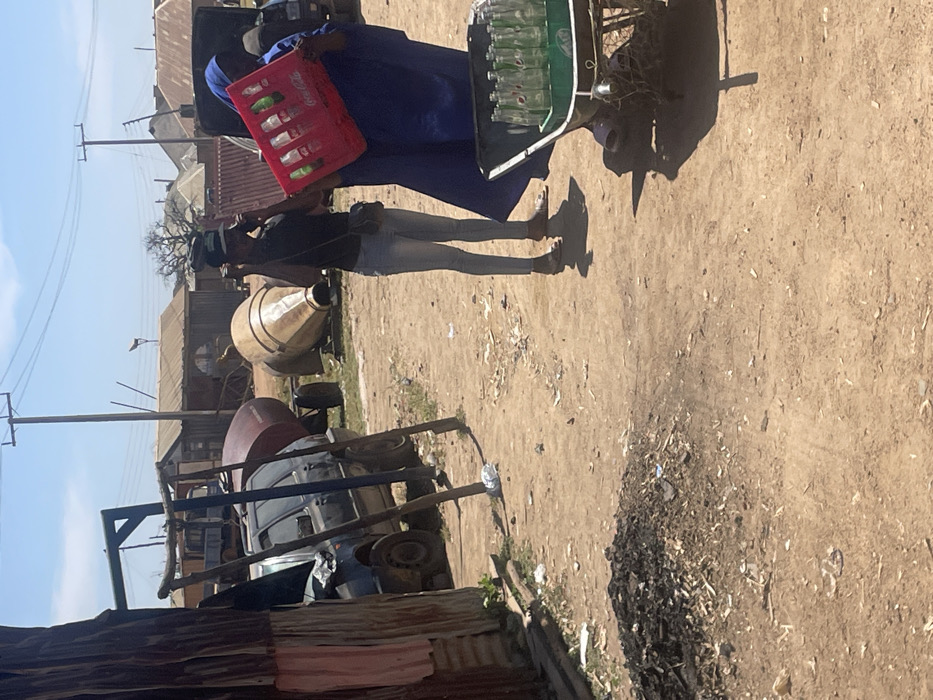 The scene, set in an unpaved area of Bukuru, Nigeria, under a clear, bright sky, depicts an open-air environment with various objects and individuals. In the left foreground, a corrugated metal structure stands beside a pile of dark, burnt debris and wood fragments on the dirt ground. To the right of this, a dark-colored station wagon or hatchback with its hood open is positioned, flanked by two rough wooden poles leaning against it. In the mid-ground, two individuals are present. One female subject, wearing a black shirt, light blue jeans, brown sandals, and a dark cap, is depicted holding a smartphone to her right ear. To her immediate right, a second individual, partially obscured by a blue garment, carries a red plastic Coca-Cola crate filled with assorted beverage bottles. In the lower right corner, a metal wheelbarrow contains a green plastic crate holding numerous empty clear glass bottles, some with visible Pepsi branding. The background reveals a series of low-rise structures with corrugated metal roofs. Two large, detached concrete mixer drums, one maroon and one beige, lie horizontally on the ground. Overhead, multiple utility poles with power lines traverse the scene. The ground surface is predominantly dry dirt and gravel, with scattered litter. Shadows are cast to the right, indicating bright sunlight.