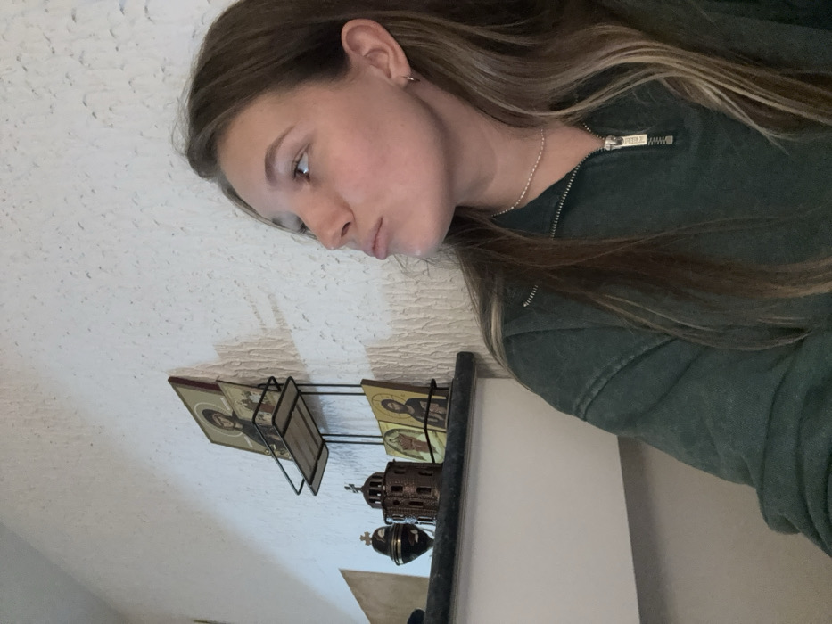 A young woman in a green jacket looks to the lower left. She wears a silver chain and has light brown hair. Behind her, a textured white wall and a metal shelf with religious icons are visible. Below the icons, there is a decorative metallic item. The image appears to be taken from a slightly above-eye-level perspective.