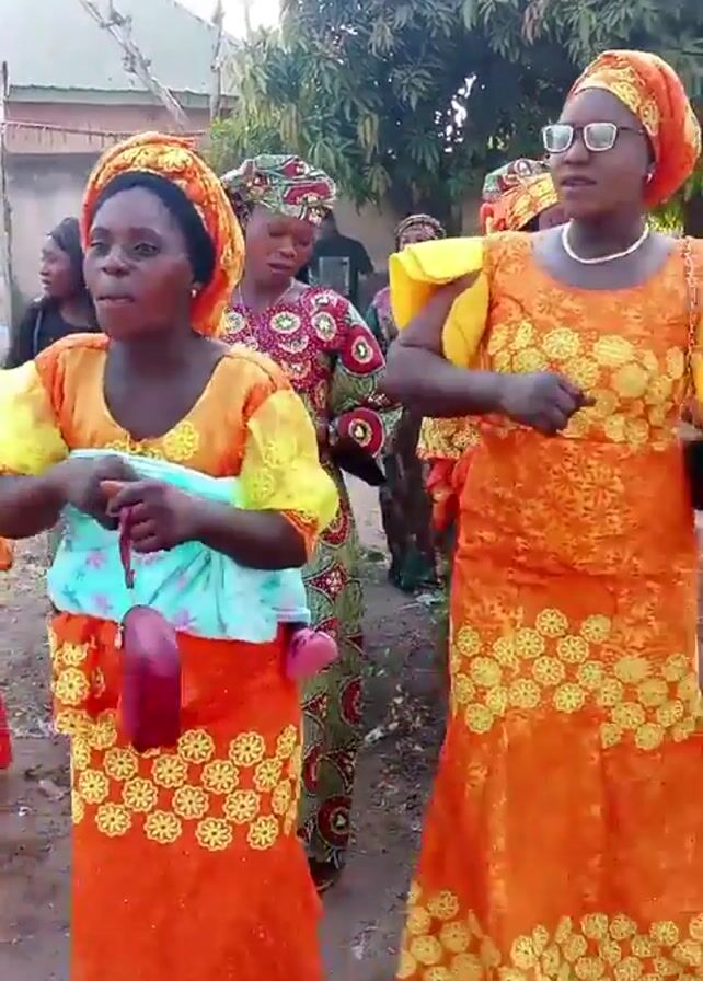 A group of women, dressed in matching bright orange outfits with yellow floral embroidery, are gathered outdoors. Many of them wear matching headwraps. One woman carries a baby wrapped in a light blue and white cloth. Some of the women carry small purses. The setting appears to be a residential area with trees and buildings in the background. The women seem to be moving or dancing to music, and there is a lively atmosphere.