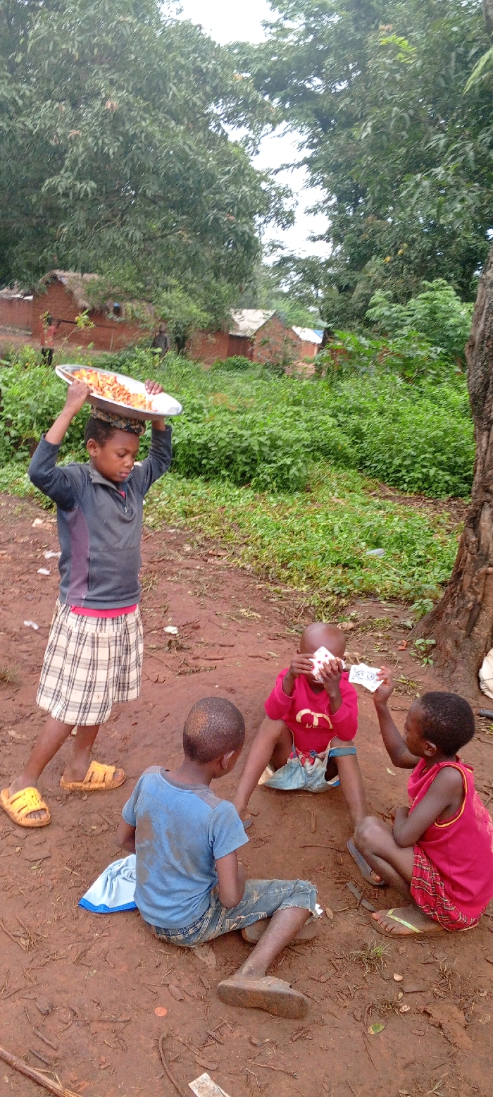 Five children are on a dirt ground surrounded by greenery and houses in the background. One child balances a plate of food on their head, wearing a gray shirt and plaid shorts. The other four are seated, one in red with playing cards, another in red, and one in blue. They are wearing sandals. The ground is reddish-brown.