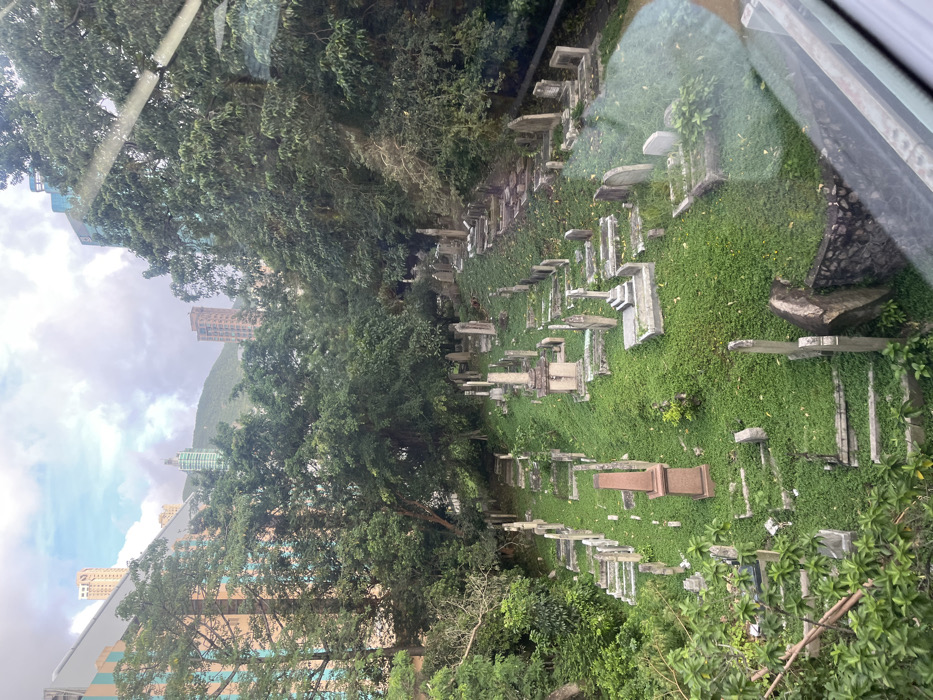 The image depicts a hillside cemetery in the Happy Valley district of Hong Kong Island, China, likely the Hong Kong Cemetery
