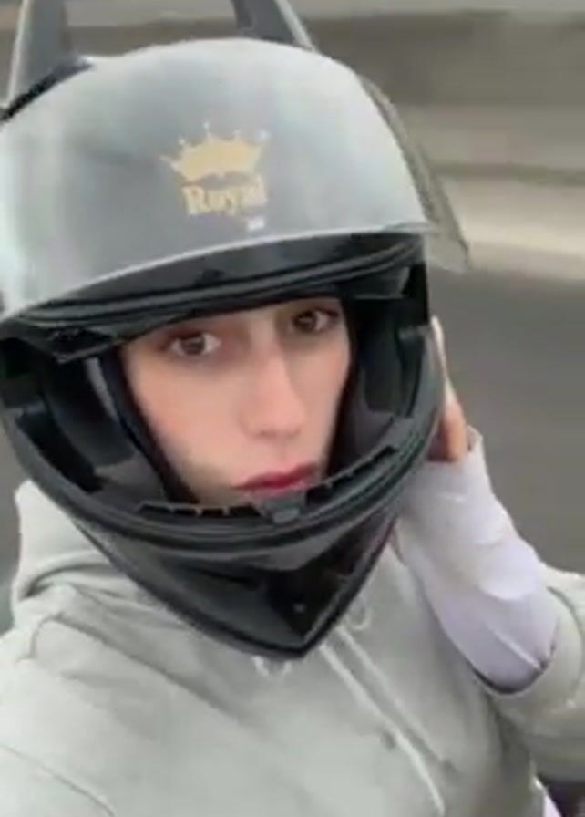 A person wearing a gray hoodie and a black motorcycle helmet with two ears on top is riding on the back of a motorcycle. The person is looking at the camera, and the person driving the motorcycle is wearing a green and black helmet. The background is blurry and appears to be a highway. The weather appears overcast.